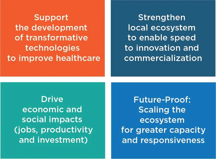 Nurture a robust and innovative local health and life sciences ecosystem that supports research collaboration, the commercialization of discoveries and helps entrepreneurs to start and grow the next generation of high growth firms.